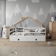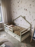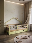 Ліжко Mini House виготовлене з масиву натурального дерева вільхи та має міцну, надійну конструкцію, доповнену декоративною верхньою частиною у формі будиночка. Дизайн створює атмосферу затишку й гри, а також робить перехід від дитячого ліжечка до більших моделей більш комфортним для дитини.Високий захисний борт забезпечує максимальну безпеку під час сну. Усі планки ретельно заокруглені, що гарантує безпеку та додає ліжку естетичного, акуратного вигляду.Mini House доступне у різних розмірах та кольорах, підходить дітям від моменту, коли вони переростають маленьке ліжечко, і може комфортно слугувати до 10–12 років (у розмірі 160×80 см). Модель легко вписується в будь-який інтер’єр, створюючи для дитини власний затишний простір.Комплектація- Каркас ліжка з масиву вільхи